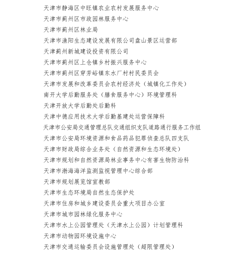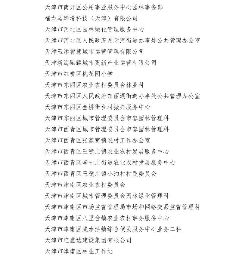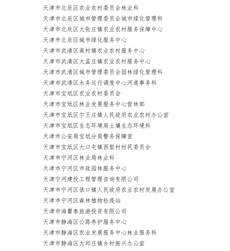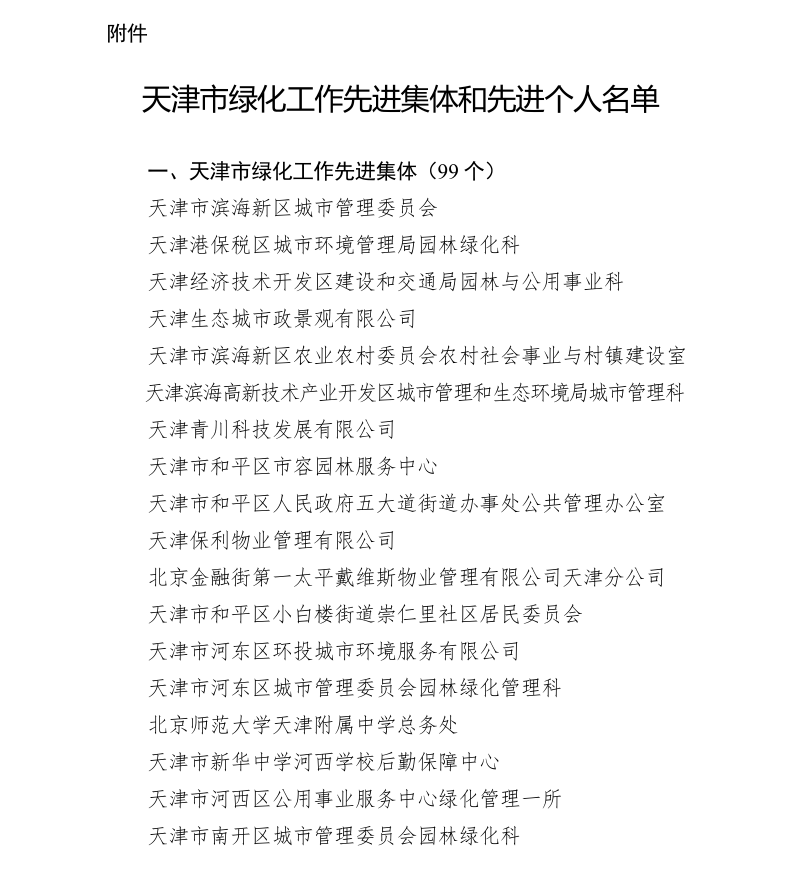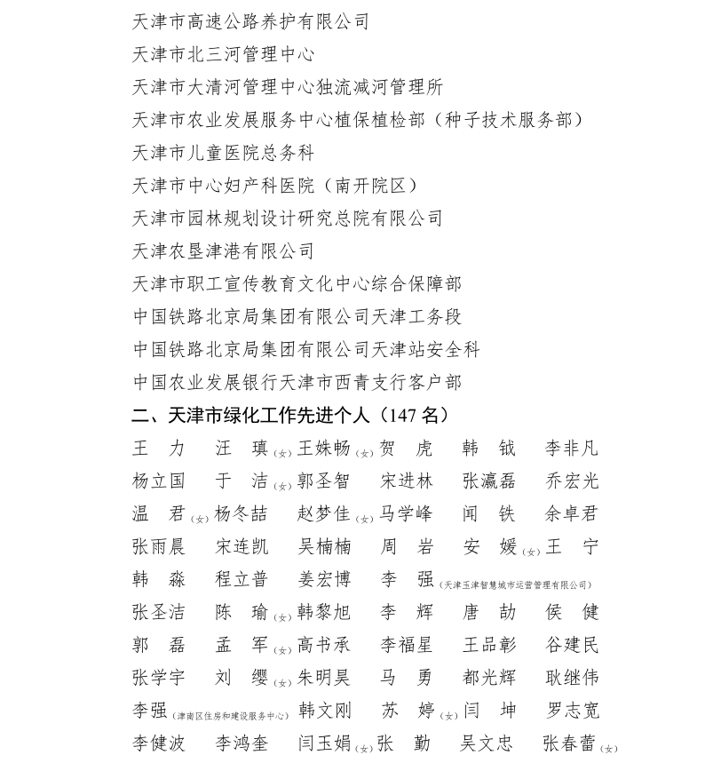 為表彰先進、樹立榜樣,進一步激發廣大幹部職工投身國土綠化事業的積極性、主動性和創造性,市人民政府決定,授予天津市濱海新區城市管理委員會等99個單位“天津市綠化工作先進集體”稱號,授予王力等147名同誌“天津市綠化工作先進個人”稱號。